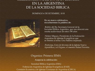 La Sociedad Bíblica Argentina reúne el esfuerzo de las Iglesias Cristianas para la difusión de la palabra de Dios a través de la oferta permanente de Biblias de manera accesible. Son destacados sus esfuerzos de traducción y edición de este hermoso material. Nuestra Iglesia desde hace algunos años es miembro de dicha Sociedad.
